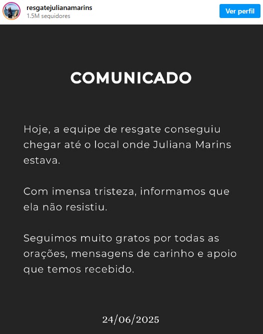 O acidente ocorreu na última sexta-feira (20), quando Juliana tropeçou, escorregou e caiu a cerca de 300 metros da trilha. Turistas avistaram a situação cerca de três horas depois e alertaram a família pelas redes sociais, enviando localização exata, fotos e vídeos, incluindo imagens de drone.