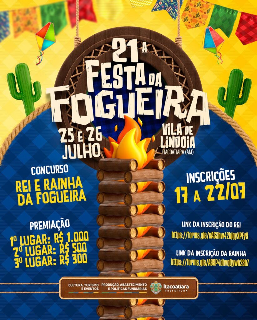 A tradicional Festa da Fogueira está de volta em 2025 com sua 21ª edição e promete agitar a Vila de Lindóia, em Itacoatiara (AM), com muita animação, cultura e simbolismo. O evento, que já se tornou parte do calendário cultural da comunidade, traz como destaque o esperado concurso que elege o Rei e a Rainha da Fogueira — e as inscrições encerram nesta segunda-feira, 22 de julho.