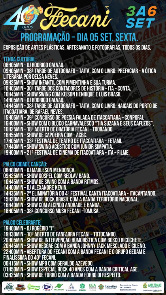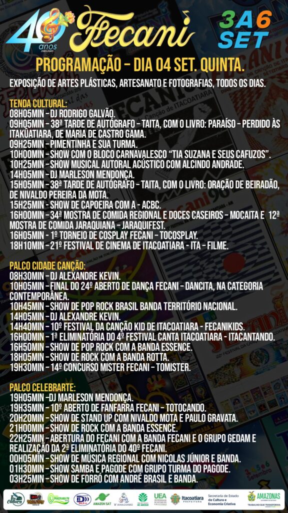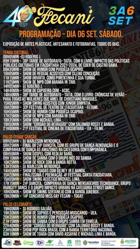 O Festival da Canção de Itacoatiara (Fecani) anunciou a programação oficial da 40ª edição, que será realizada de 3 a 6 de setembro, no Centro de Eventos Juracema Holanda, em Itacoatiara (AM). Reconhecido como o maior festival de música autoral da Amazônia, o evento reunirá mais de 40 atividades culturais e esportivas, além de shows nacionais e apresentações artísticas em três palcos: Tenda Cultural, Palco Cidade Canção e Palco Celebrarte.