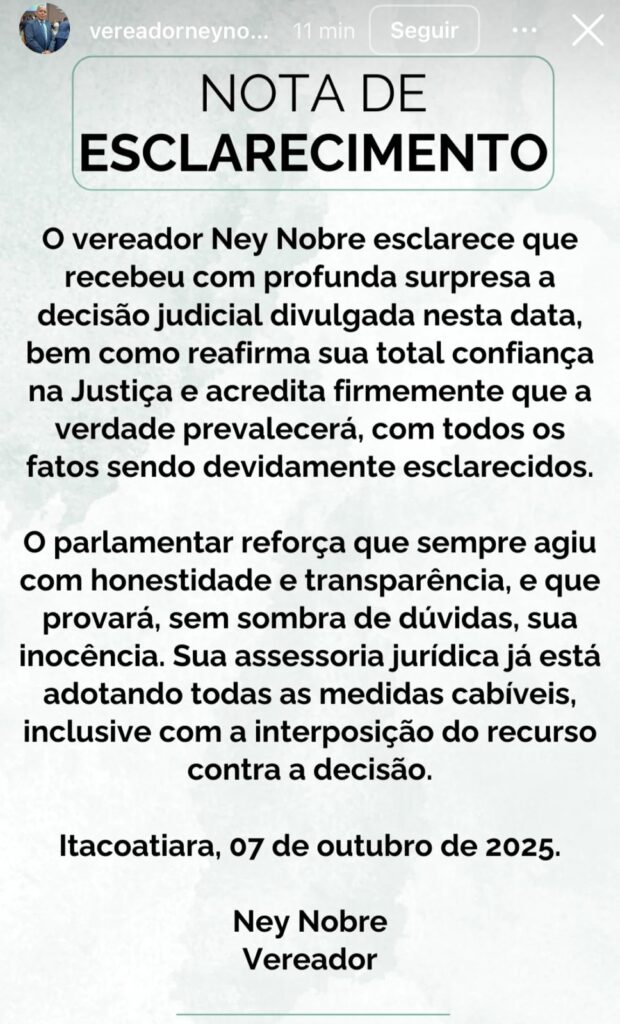 Após a publicação, o vereador publicou uma nota nas redes sociais e declarou que recebeu “com profunda surpresa a decisão judicial”. O parlamentar, contudo, reafirmou sua confiança na Justiça e disse que acredita que a verdade prevalecerá. A assessoria jurídica de Ney Nobre informou que está adotando todas as medidas cabíveis, inclusive, a interposição do recurso contra a decisão.