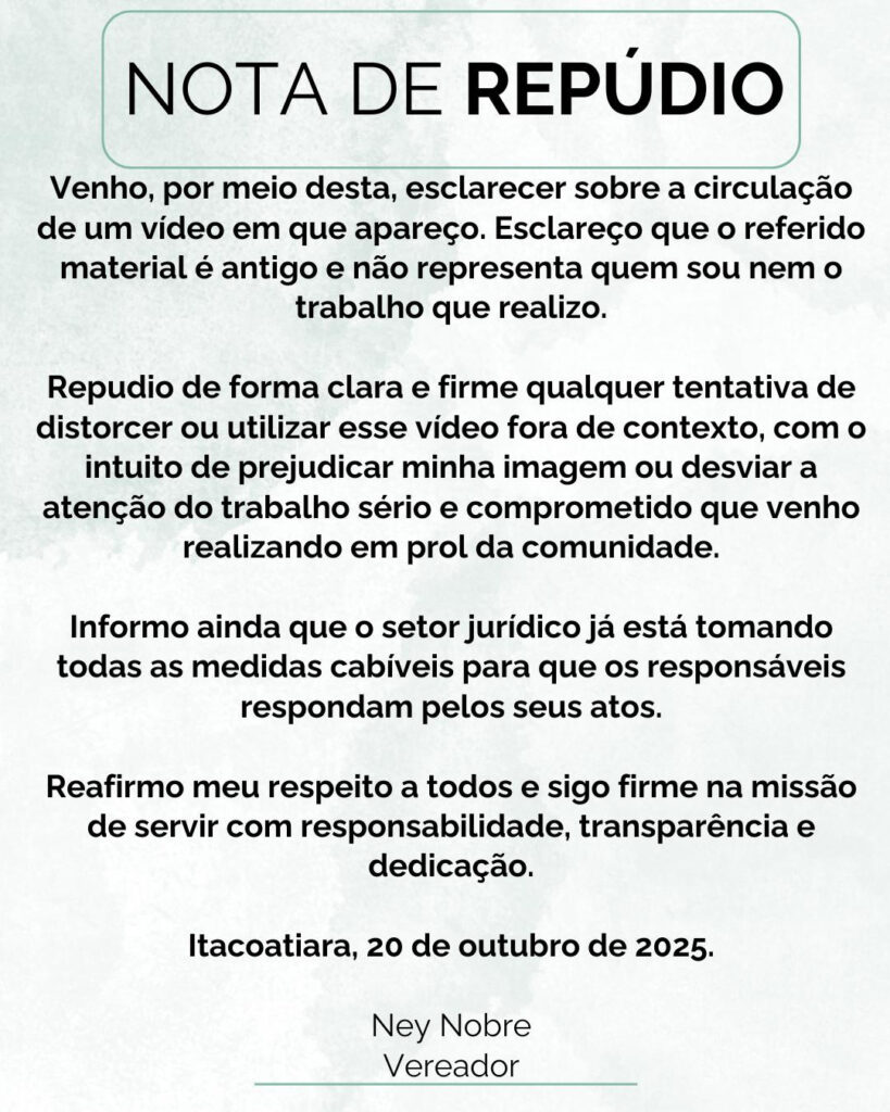 Após a publicação do vídeo, o vereador Ney Nobre enviou nota à reportagem na noite desta segunda-feira, 20, em que afirma que o material é antigo e não representa o trabalho que realiza atualmente. Ele repudiou o que chamou de “tentativas de distorcer o conteúdo fora de contexto” e disse que seu setor jurídico está adotando medidas cabíveis contra os responsáveis pela divulgação.