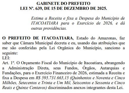 A Prefeitura de Itacoatiara (a 270 quilômetros de Manaus) publicou, na edição desta segunda-feira, 29, no Diário Oficial dos Municípios do Amazonas (DOM-AM), a Lei nº 639, de 15 de dezembro de 2025, que estima a receita e fixa a despesa do Município de Itacoatiara para o exercício financeiro de 2026. O orçamento total aprovado é de R$ 595.731.665,15.