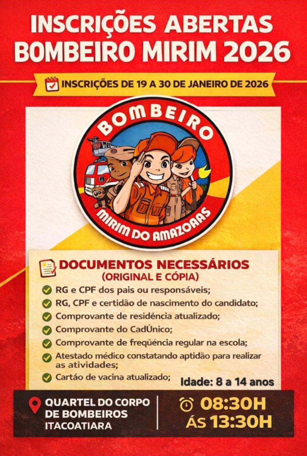A partir da próxima segunda-feira (19/01), estarão abertas as inscrições para 900 vagas do Programa Bombeiro Mirim (Proebom) do Corpo de Bombeiros Militar do Amazonas (CBMAM). A iniciativa alcança crianças e adolescentes de 8 a 14 anos de idade de 18 municípios do Amazonas.