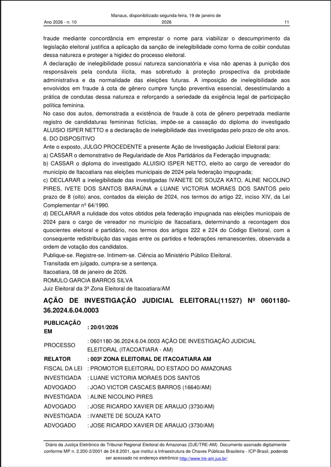 O Tribunal Regional do Amazonas (TRE-AM) publicou na edição de segunda-feira, 19, no Diário Oficial, a decisão que cassou o vereador de Itacoatiara (a 176 quilômetros de Manaus), Aluísio Isper Netto (PV), por fraude à cota de gênero. A decisão foi assinada pelo juiz Rômulo Garcia Barros da Silva, da 3ª Zona Eleitoral, no dia 8 de janeiro.