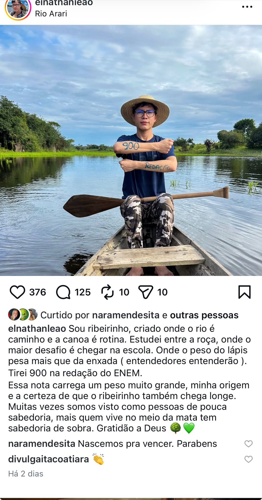O Rio Arari, em Itacoatiara, amanheceu como sempre: águas calmas, margens cobertas pelo verde da mata e o silêncio quebrado apenas pelo movimento da canoa. Mas, desta vez, o cenário simples da vida ribeirinha virou símbolo de uma conquista extraordinária. Em cima da canoa, usando chapéu de palha e com os braços erguidos, o jovem Nathan Leão, de 25 anos, celebrou um feito que inspira: nota 900 na redação do Enem.
