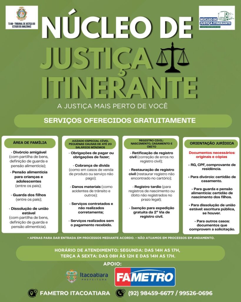 ITACOATIARA (AM) – Em uma parceria estratégica para ampliar o acesso à cidadania, o curso de Direito da Fametro Itacoatiara sedia, a partir desta segunda-feira, 20, a partir das 14h, o projeto Justiça Itinerante, do Tribunal de Justiça do Amazonas (TJAM). Durante toda a semana, equipes do tribunal estarão na unidade acadêmica para oferecer orientações e realizar mutirões de atendimento jurídico sem custos para a comunidade.